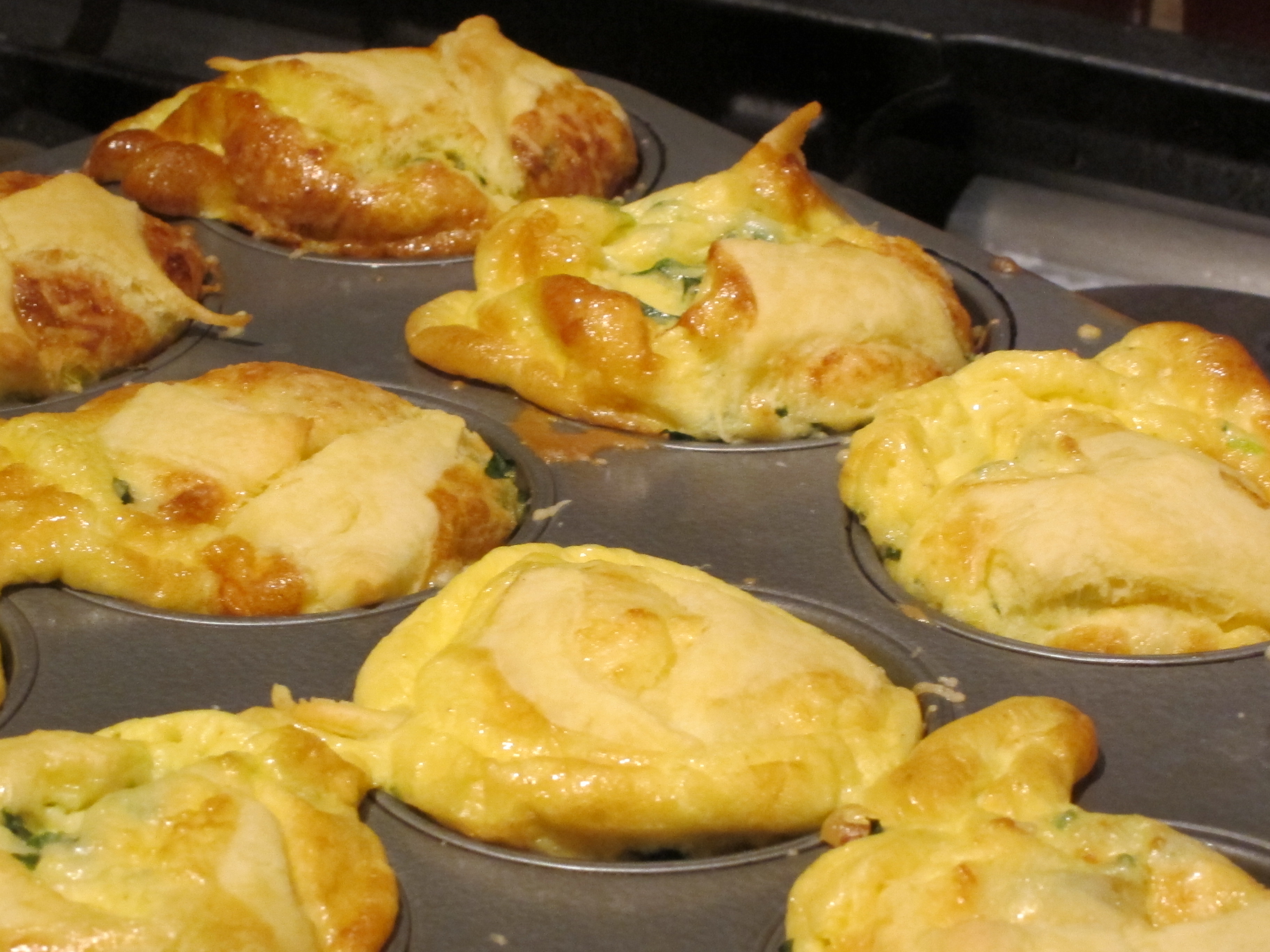 - Cut puff pastry or flaky dough into circles using a cup and place one in the bottom of each muffin cup in the tin,