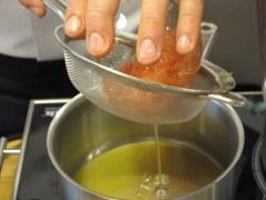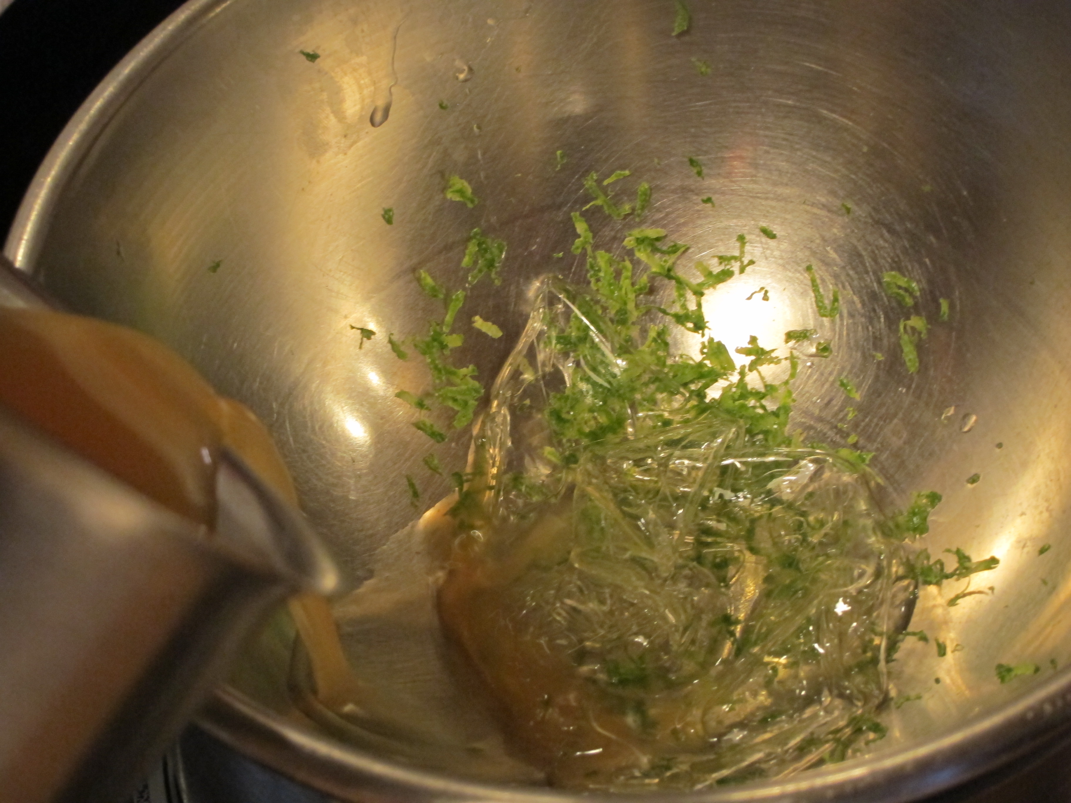 - Squeeze what’s left of the fruit into a bowl, then pass it though a strainer into the bowl with the lime zest; add the gelatin and sugar, then place the bowl over the bain marie (on a low boil)