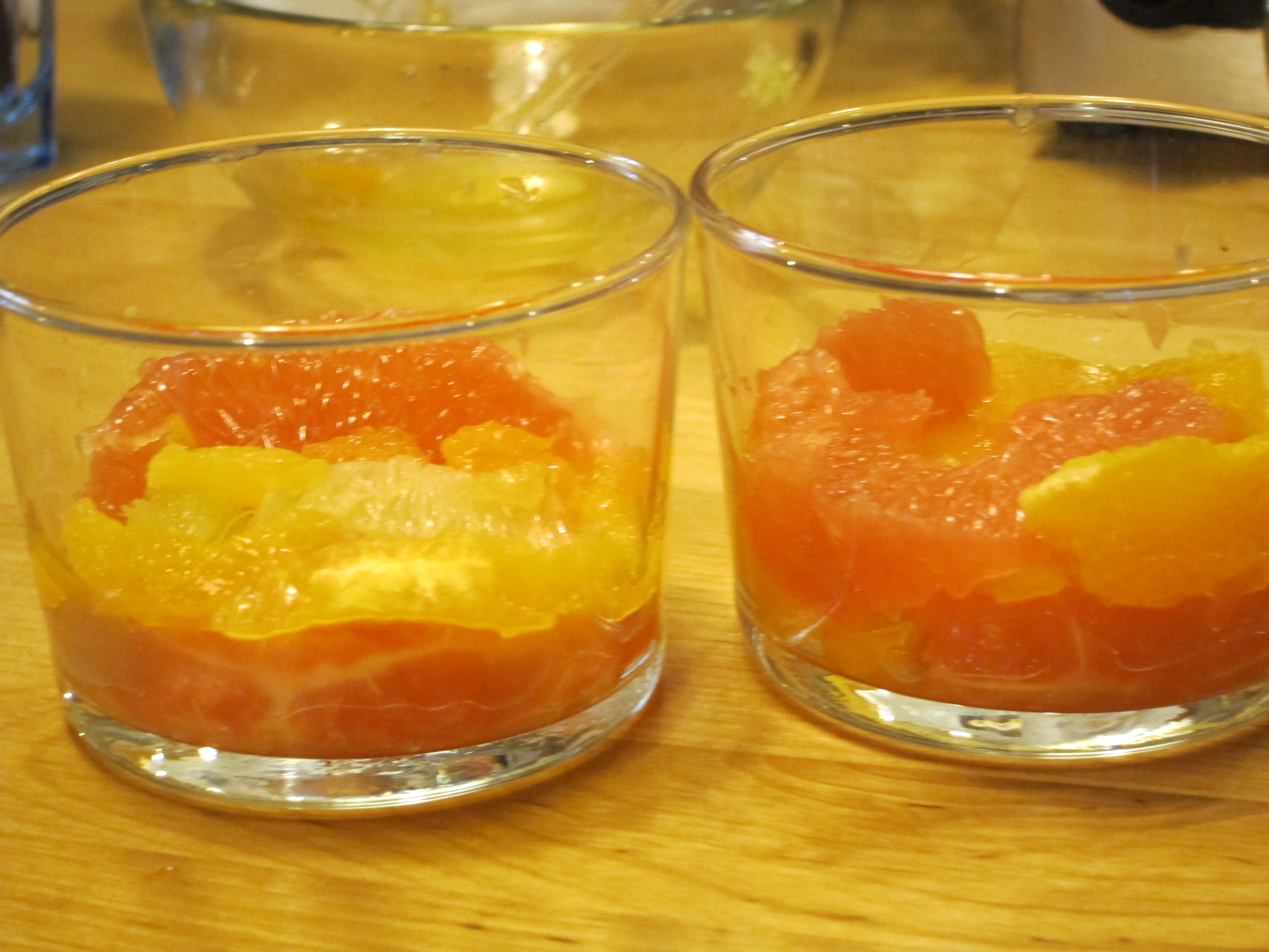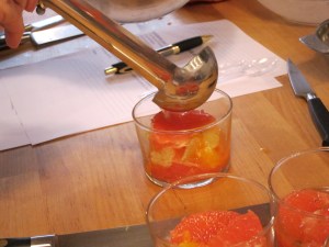 - In each verrine (little glass), layer a few pieces of each citrus fruit; then pour a ladle of the cool juice mixture into each glass