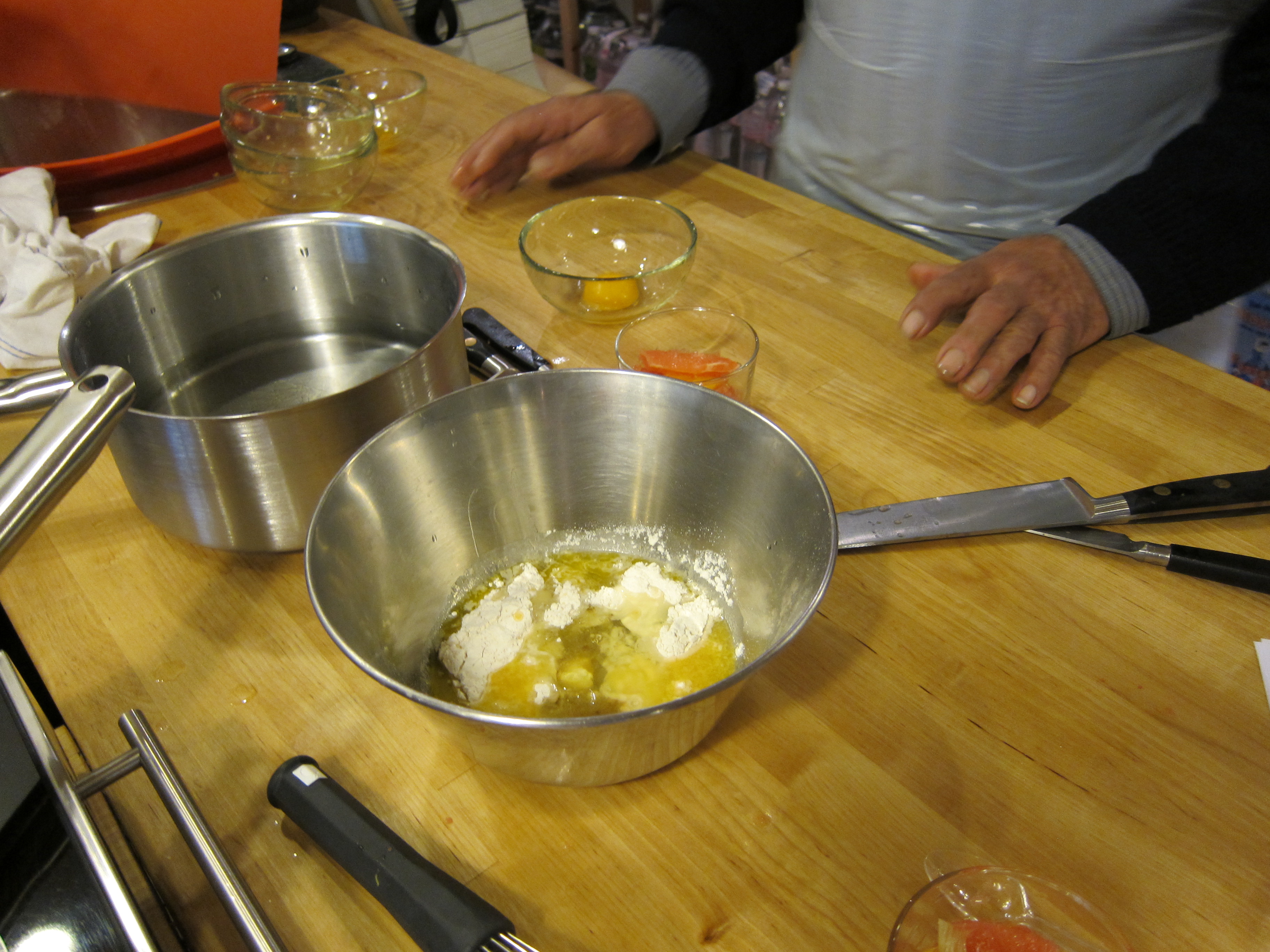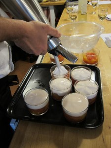 This week I went to a little 1hr workshop organized by Cuisine Évènements, Stephanie Ginoux, given by Chef Saucier Philippe Houy from Restaurant Christian Etienne a 1* Michelin restaurant in Avignon. It took place in a little organic produce market called Terre et Bio in St. Remy, about 15 minutes North of our house. We made one simple dessert, using citrus fruits. I have never really worked with gelatin paper or whipped cream canisters, so this was a fun lesson. Now I have an excuse to buy the professional whip cream canister, which in french is called a ‘siphon’. We did this recipe very quickly, even though it should have had a lot more time to chill before putting it all together. We also had all of this going at once, but I wrote out the recipes separately so that you could follow more easily.