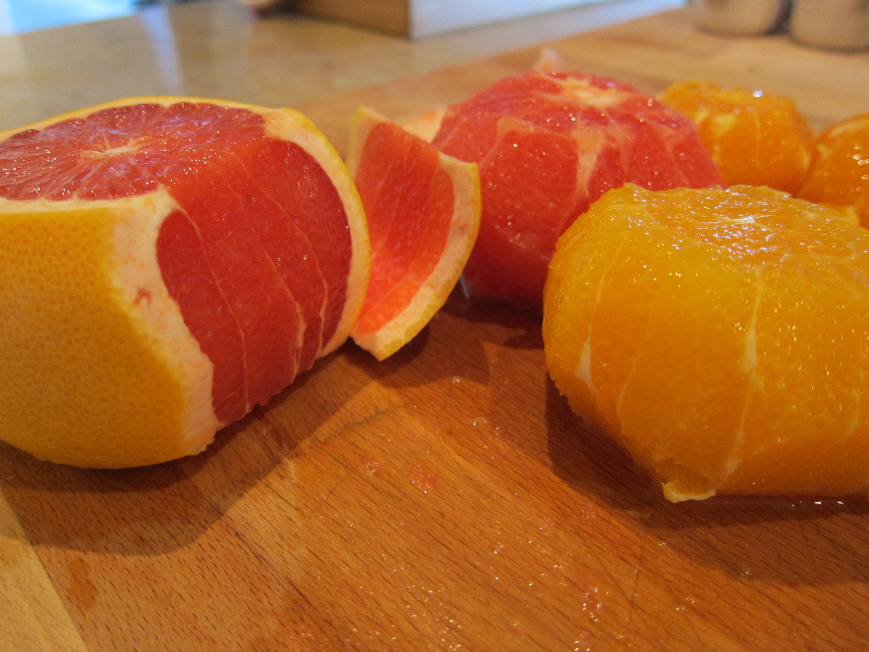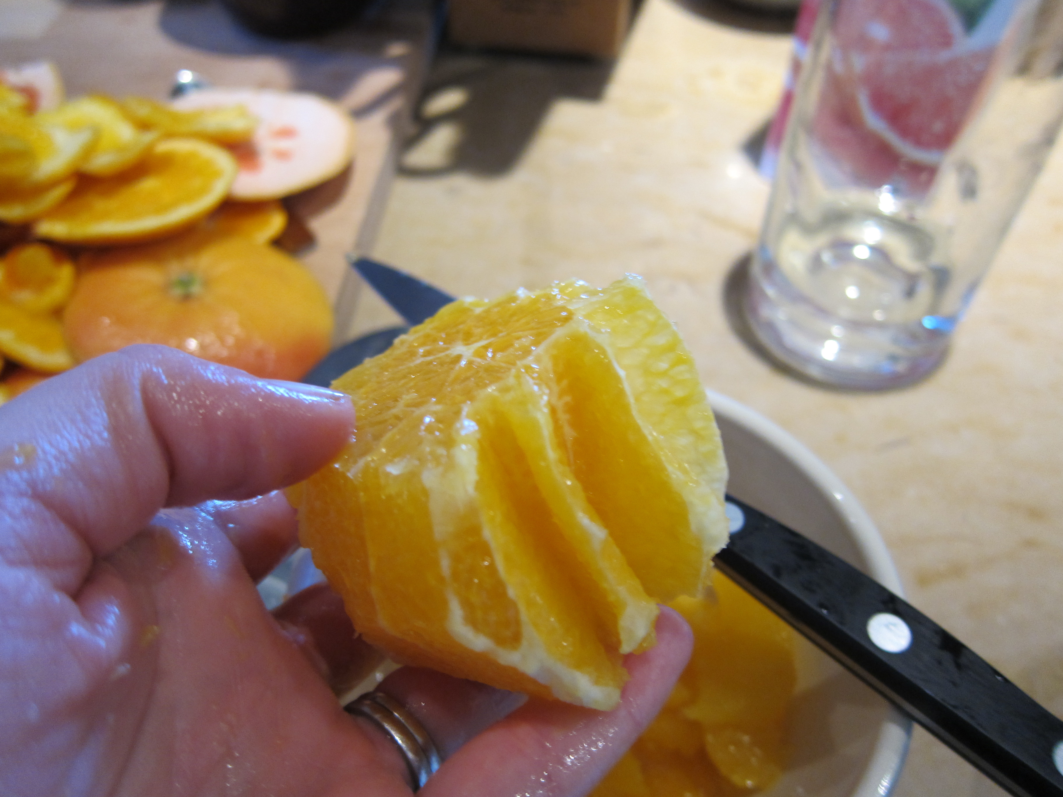 - Then over a small bowl, very carefully cut out just the meat of each section of each fruit. Cut in between the white lines of the skin.