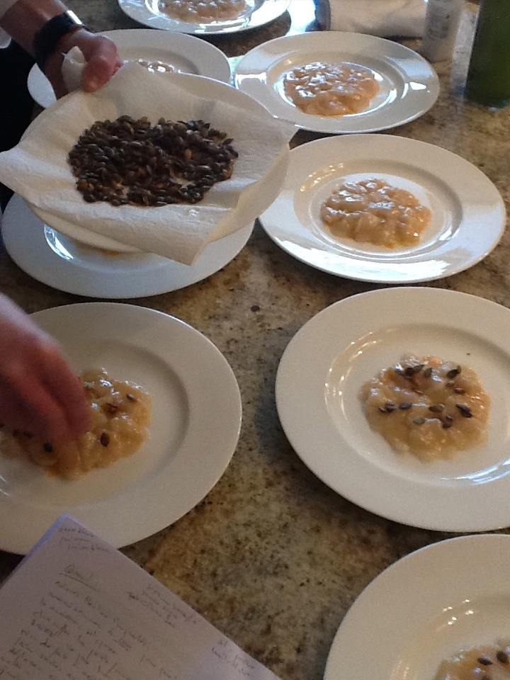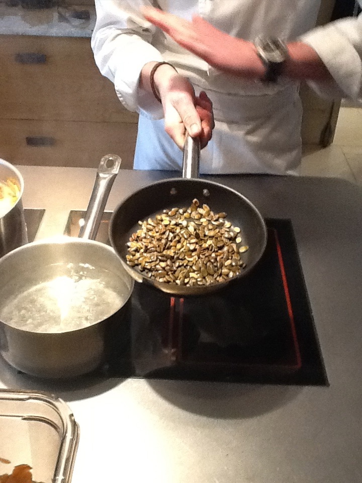 - Toss the pumpkin seeds in a warm slightly oiled pan and heat them until slightly brown; remove and lightly toss with a few pinches of fine salt