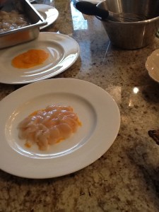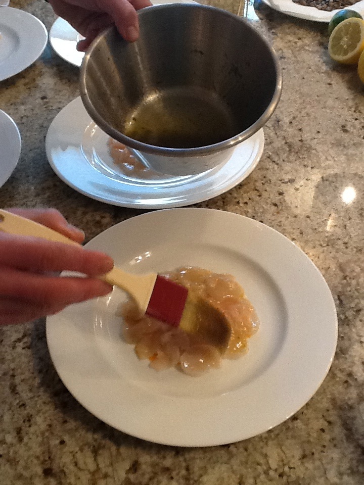 I have never really taken the leap and attempted to cook scallops (Noix de St. Jacques), on my own. So this class was a great way to get over that fear. They aren’t as daunting when you have a professional chef on hand to show you just how to handle them. Taking off the coral wasn’t obvious. There is a piece of milky white skin just opposite of the coral tail. You must delicately remove the skin, which will pull some thin skin from the side, which is attached to the coral. If done well, this all comes off together and your scallop is ready to be prepared.