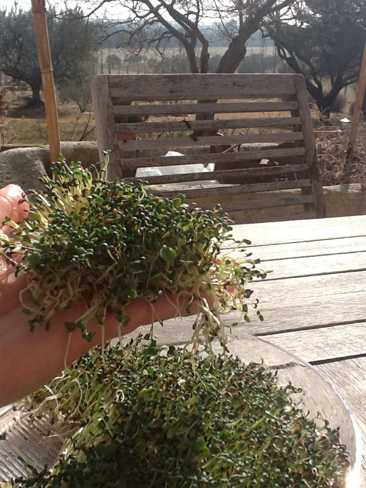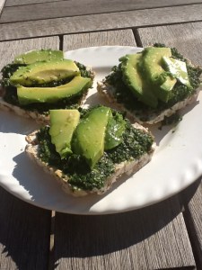 For lunch I often make little toasts with avocado, chard pesto and sprouts, then top them with lin seeds and sunflower seeds and drizzle with the olive oil we make here on the property.