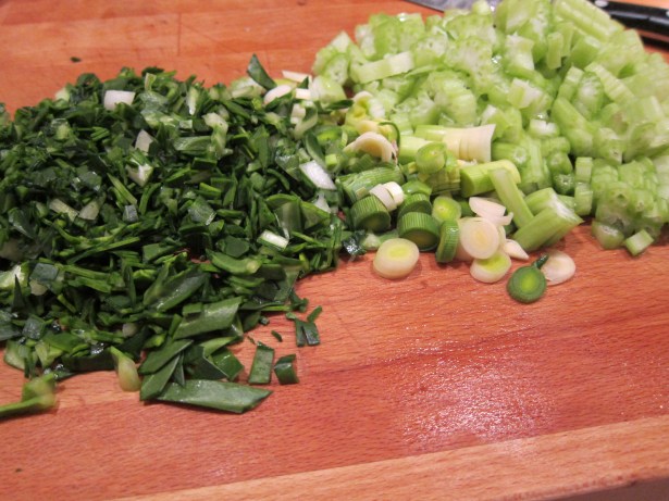 - Sautee the celery, leeks and chard in a bit of olive oil; toss in the garlic once wilted