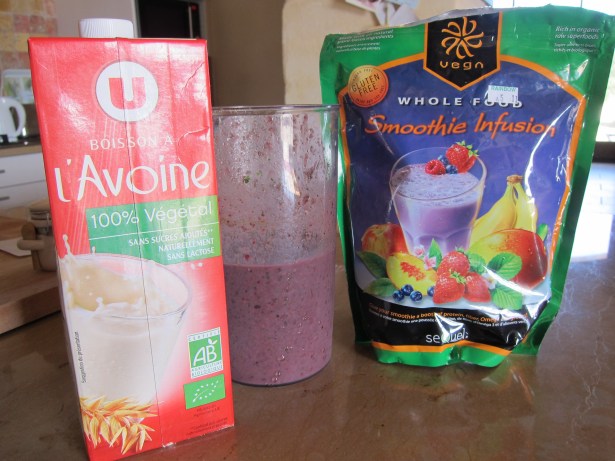 Smoothies can be such an easy and pleasant way to get some vitamins every day. Like juicing, the combinations are just about endless. Here in France, I find the frozen fruit availability is a bit limited. In the states, Trader Joe’s, Whole Foods and Safeway offer organic frozen fruit. You can also buy organic fruit and freeze it in little Ziploc bags. I don’t recommend freezing the spinach. I find that the fresh spinach in the smoothie adds virtually no flavor bad or good. It’s the bad flavor I was worried about tasting. So I think it’s a win, win. I also like to add a scoop of the Vega Whole Food Smoothie Infusion. You can buy it at most health food stores. It is plant-based and contains: Yellow pea protein, organic hemp protein, organic sprouted flax seeds, organic brown rice protein, organic green food blend (spirulina, organic wheat grass, organic alfalfa grass, organic barley grass, organic spinach, organic sprouted broccoli, organic kale, organic kelp, organic dulse), inulin (from chicory root), natural flavors, xanthan gum.