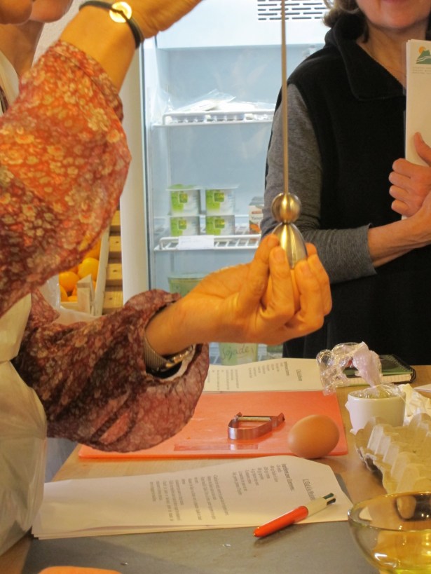 This is one of two egg recipes that we did at the 1 hour atelier organized by Stéphanie Ginoux of Cuisine Évènements and taught by Chef Saucier Philippe Houy from Restaurant Christian Etienne a 1* Michelin restaurant in Avignon. Eggs can be presented in so many interesting ways, so I of course needed a new gadget after this lesson. The ‘toque oeuf’ is used to cut off just the top of the egg. It’s like magic, as it worked perfectly every time. The egg whites get blended with cheese, cream and spices, then poured back into their shells with the yolks which have been warmed in a steam bath for 15 minutes. The toasted breadstick works sort of as an edible stirring stick/spoon.