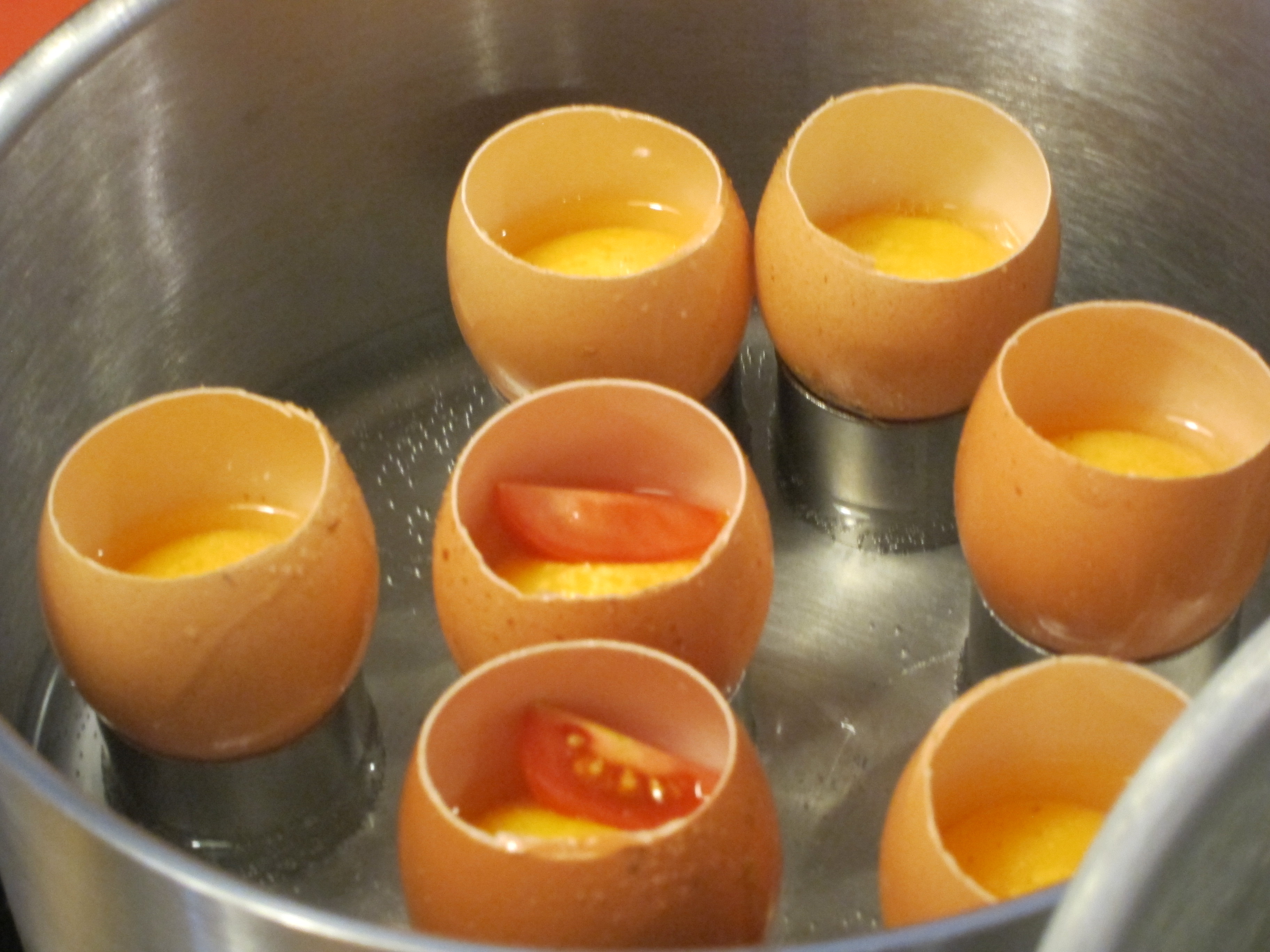 - Over a bain marie with very shallow water place the rings or egg holders in the water, then the egg shells with yolks on the rings. Cut the cherry tomatoes in half and add a half to each egg shell. These will steam for about 15 mins while you prepare the cream