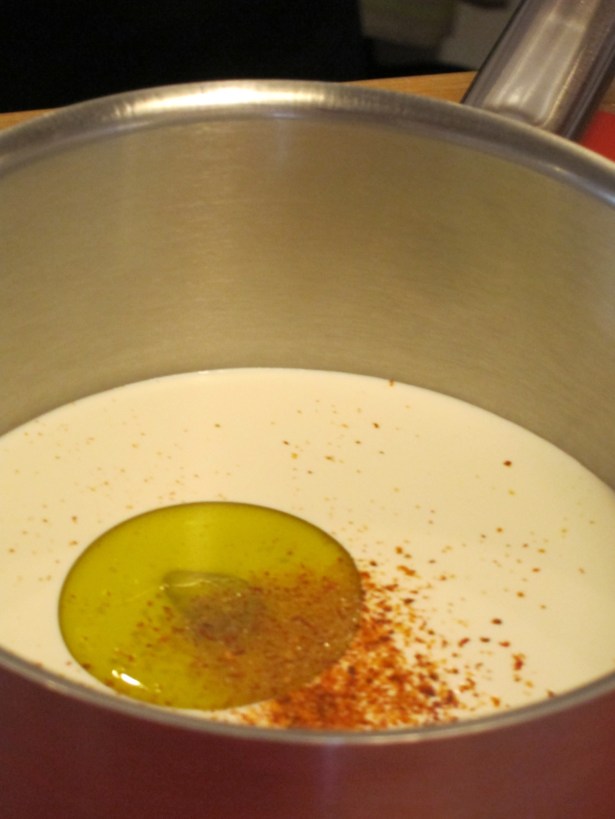 - In a saucepan, add the olive oil, creme and spices and heat until warm but not boiling