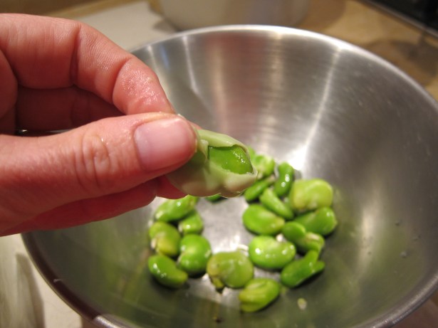 1. Take beans out of their pods; boil a small pot of water; add beans to water and boil for 5 minutes or until they are bright green